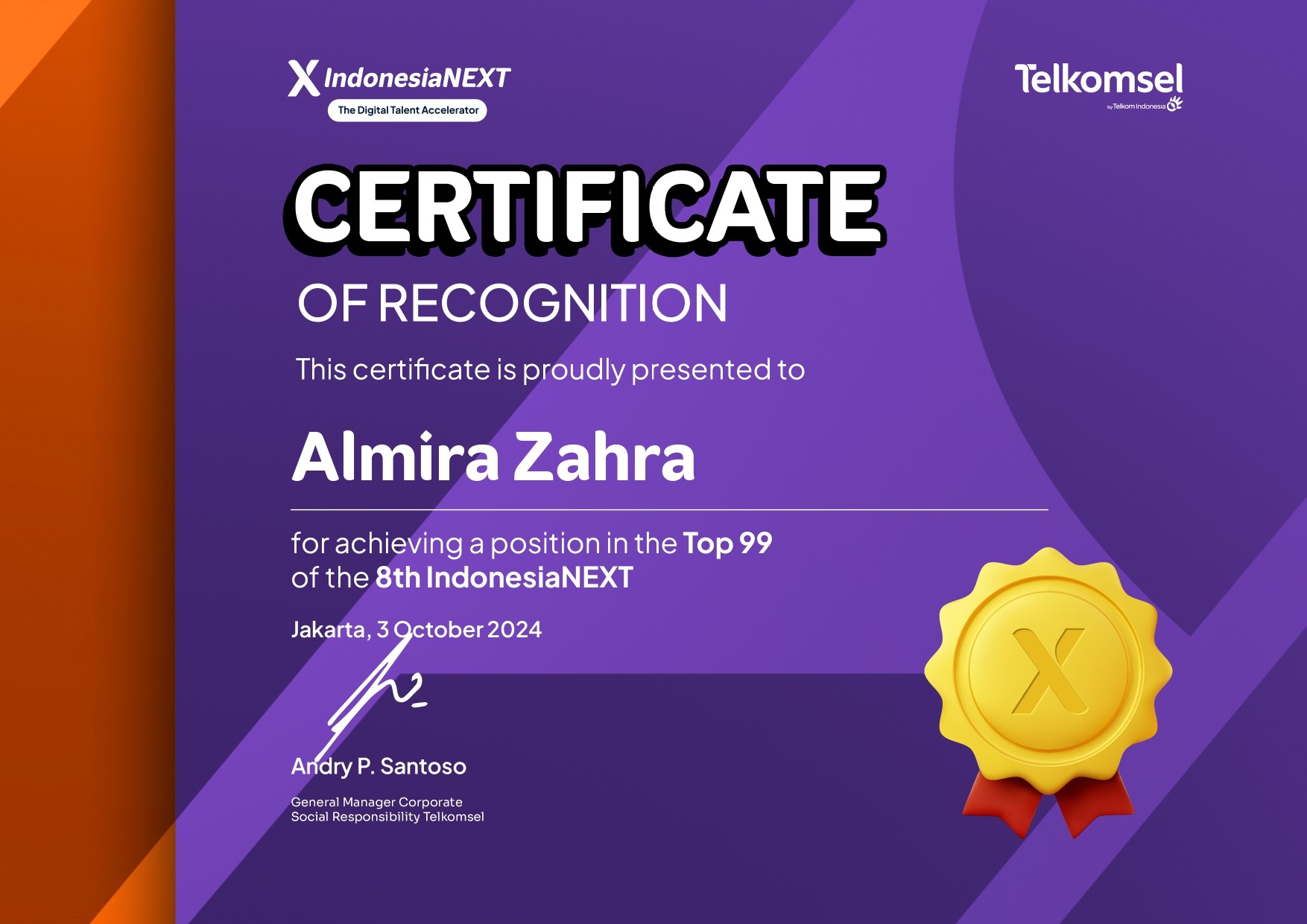Certificate of Recognition: Top 99 of the 8th Indonesia NEXT