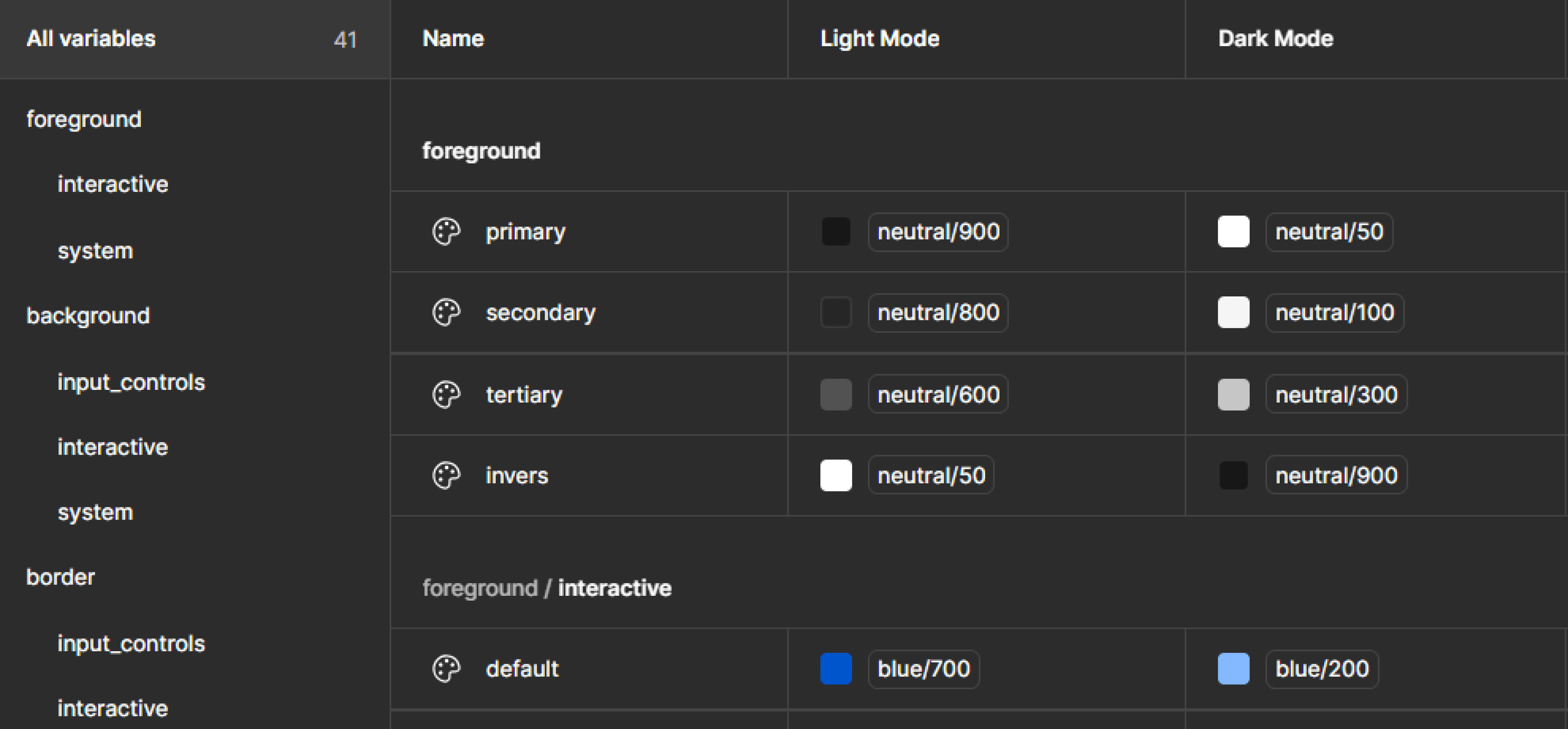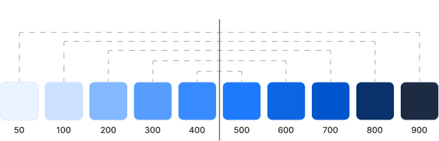 For instance, if a button color is 700 in light theme, it will be 200 in dark theme. If a section message background is 50 in light theme, it will be 900 in dark theme.