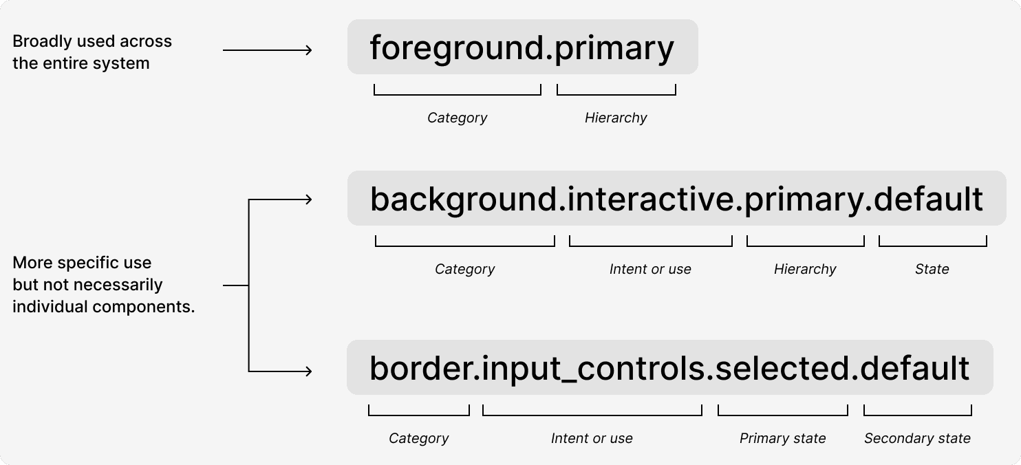 I start with exploring design systems from big companies like Material, Carbon, Atlassian, or Fluent to learn about their semantic naming style. From that research, semantic color sets can be broken up into 3 main categories that all work together to style all UI elements.