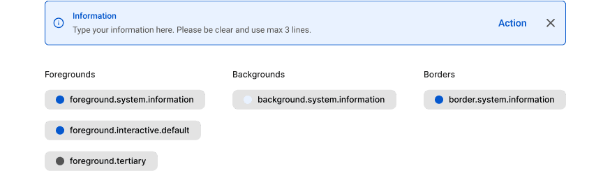 The above example, I have a information variant of a feedback banner. Each category has a “.system.information” sub-category. I am still using foreground.tertiary for the description and icon button. Also, using the foreground.system.information for the tittle and icon. And, using foreground.interactive.default for action button.